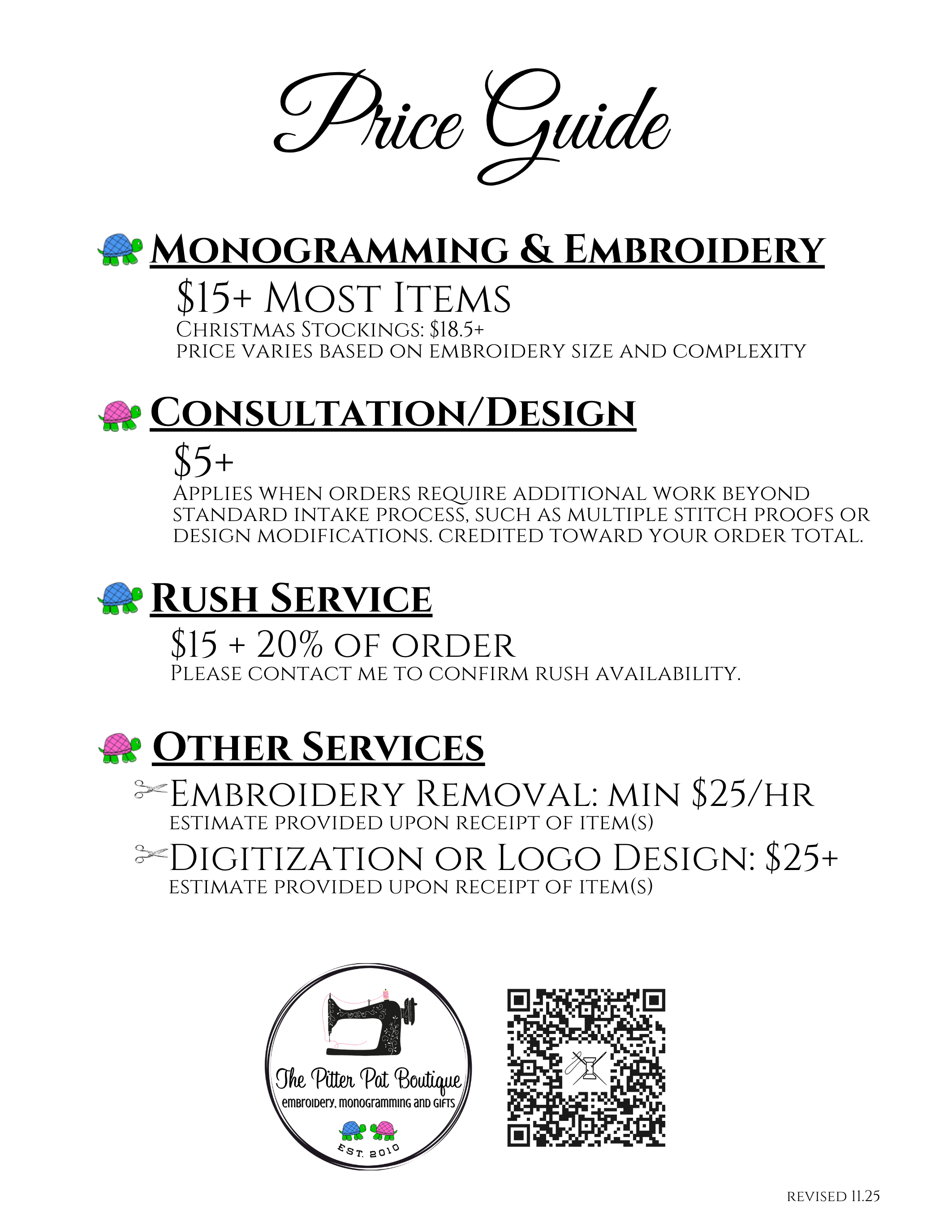 turnaround was fast and the embroidery looks amazing. When I need monogramming or embroidery done in the future, I'll definitely be returning to The Pitter Pat Boutique!Charlene W.